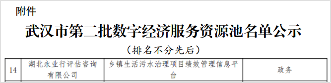 近日,武汉市经济和信息化局公布第二批数字经济服务资源池遴选工作评审结果,湖北永业行评估咨询有限公司自主研发的《乡镇生活污水治理项目绩效管理信息平台》成功入选。
