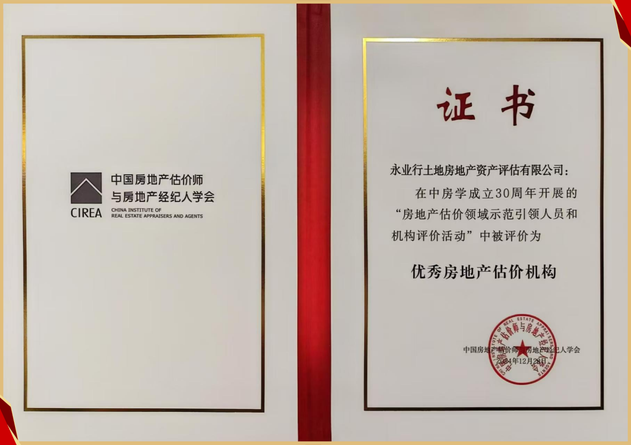 在“房地产估价领域示范引领人员和机构评价活动”中,永业行凭借稳健经营、专业服务、创新发展以及履行企业社会责任等多方面的杰出表现,赢得了行业认可,荣获 “优秀房地产估价机构” 称号,有力地彰显了公司在行业内的领先地位和品牌影响力。