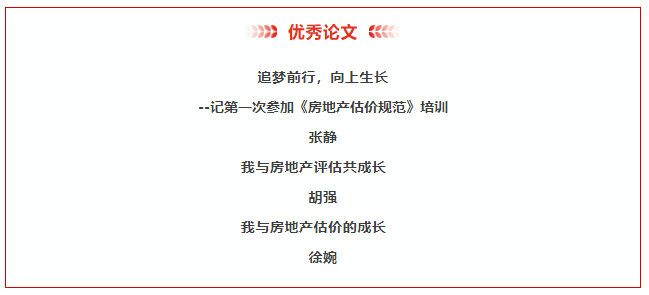 此外,永业行张静、胡强、徐婉等三位估价师撰写的《追梦前行,向上生长 -- 记第一次参加 <房地产估价规范> 培训》《我与房地产评估共成长》以及《我与房地产估价的成长》等论文也凭借其真挚的情感、详实的案例和深刻的行业见解成功入选文集,为房地产估价行业的理论发展与经验传承添砖加瓦。